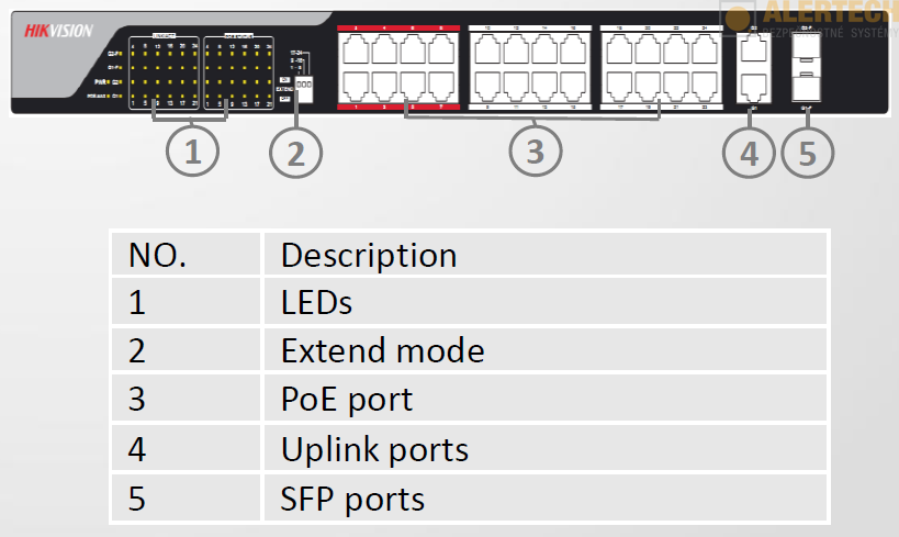 Manažovateľný PoE switch, 24 x PoE porty pre pripojenie a napájanie IP kamier a IP videovrátnika + 2 metalické dátové porty (uplink) pre pripojenie k videorekordéru alebo ďalšiemu switchu + 2 SFP porty pre pripojenie do optickej siete, celkový výkon pre všetky porty maximálne 180W, prioritné porty 1-8 podľa poradia poskytujú výkon až 30W pre pripojenú IP kameru, switch má funkciu "Extend mode", ktorá umožňuje pripojiť k switchu IP kameru až do vzdialenosti 250m, VLAN, QoS a ďalšie funkcie